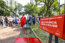 Porto Alegre, RS, Brasil, 06/03/2026: A Prefeitura de Porto Alegre entregou nesta sexta-feira, 6, o primeiro banco vermelho instalado pelo município em praças e parques da cidade, na Praça da Alfândega. A iniciativa integra um projeto de conscientização e enfrentamento à violência contra a mulher. Foto: Alex Rocha/PMPA