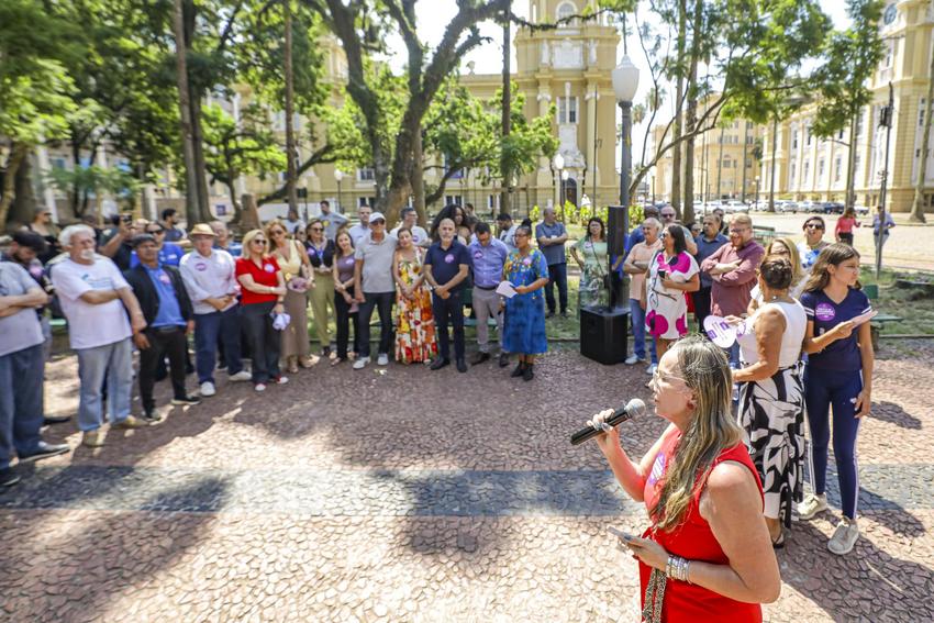 Porto Alegre, RS, Brasil, 06/03/2026: A Prefeitura de Porto Alegre entregou nesta sexta-feira, 6, o primeiro banco vermelho instalado pelo município em praças e parques da cidade, na Praça da Alfândega. A iniciativa integra um projeto de conscientização e enfrentamento à violência contra a mulher. Foto: Alex Rocha/PMPA