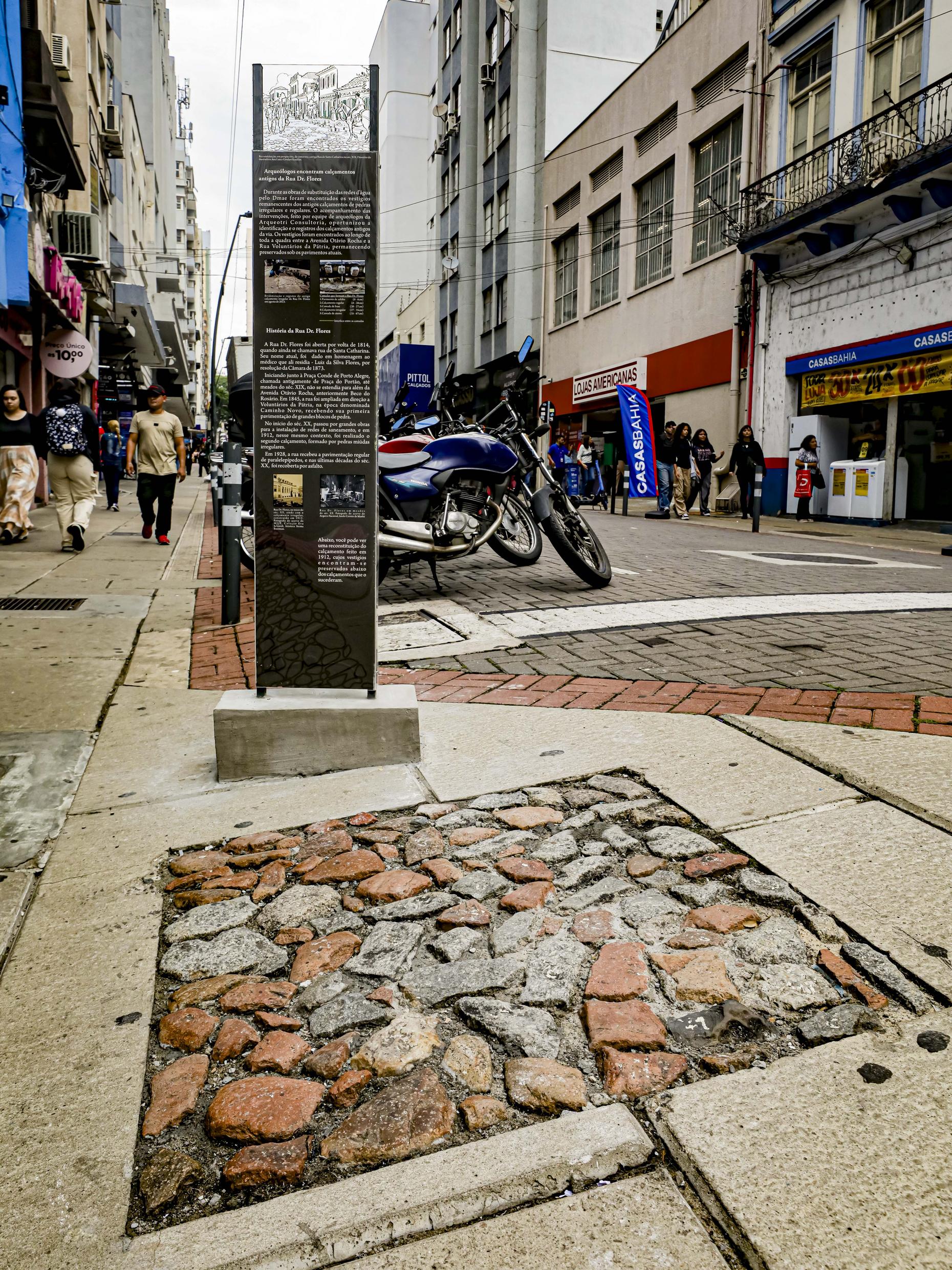 Porto Alegre, RS, Brasil, 10/03/2026: Nesta segunda-feira, 9, Porto Alegre passou a contar com o primeiro sítio arqueológico sinalizado em espaço aberto. A descoberta ocorreu durante a primeira etapa das obras de revitalização das nove vias que compõem o Quadrilátero Central, no Centro Histórico. Durante escavações na rua Doutor Flores, equipes encontraram um antigo calçamento de pedra utilizado entre 1912 e 1928, segundo a Secretaria Municipal de Obras e Infraestrutura (Smoi). Parte da estrutura foi preservada no local e passou a integrar uma sinalização patrimonial aberta à visitação. Foto: Alex Rocha/PMPA