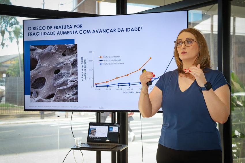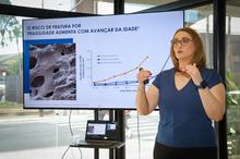 Porto Alegre, RS, 10/03/2026 Capacitação para 30 profissionais da atenção primária abordando o rastreamento e manejo da osteoporose. O encontro ocorre às 14h, no SmartLab (avenida João Manoel, 157). A palestrante foi a médica reumatologista Samanta Gerhardt, preceptora dos ambulatórios de espondiloartrites e osteoporose do Hospital São Lucas da Pucrs. Foto: Cristine Rochol/PMPA