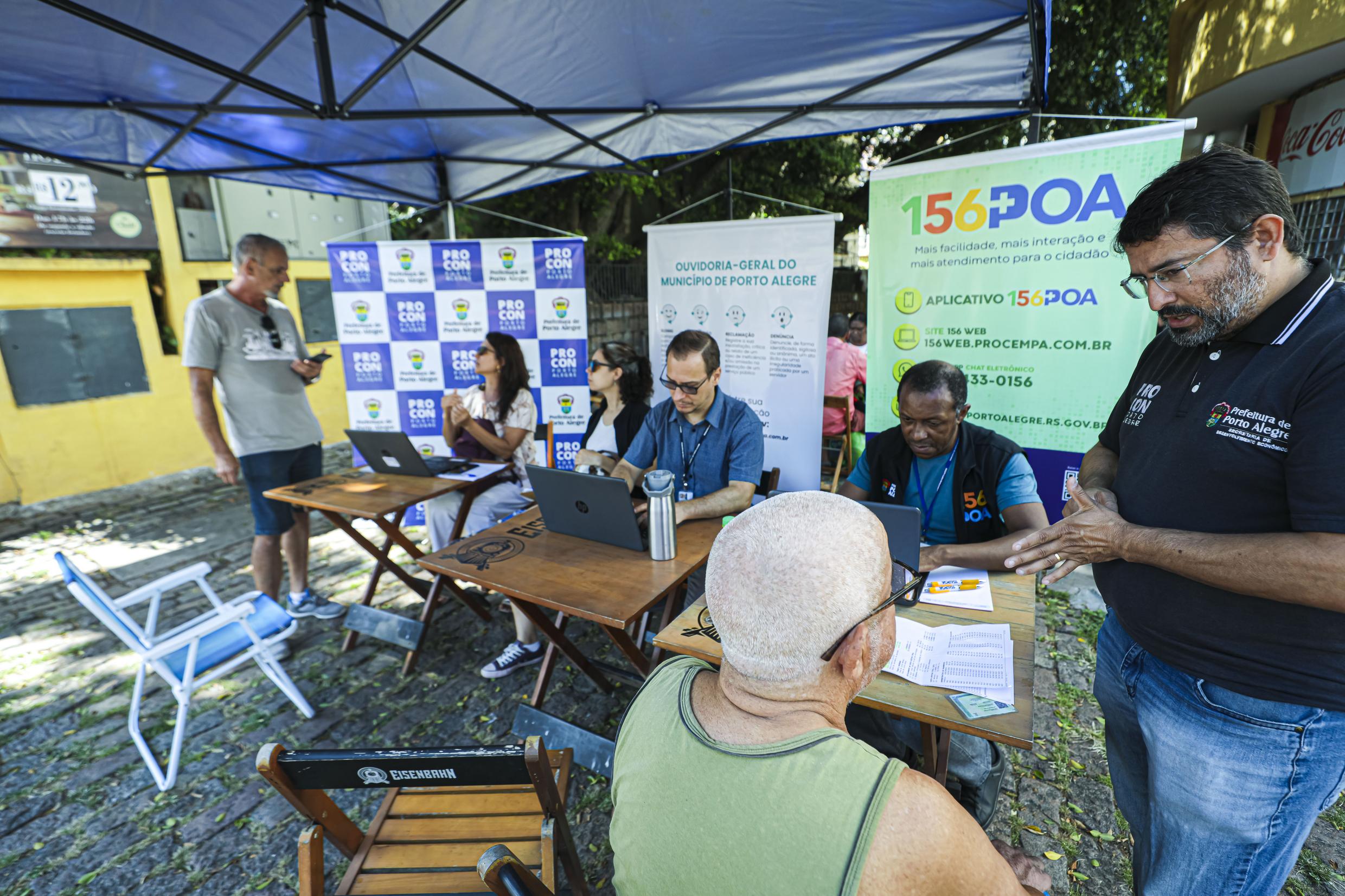 Porto Alegre, RS, Brasil, 16/03/2026: A Prefeitura de Porto Alegre promove nesta segunda-feira, 16, um mutirão de atendimento ao consumidor no Largo Glênio Peres, ao lado do Mercado Público, no Centro Histórico. A ação ocorre das 10h às 16h e é alusiva ao Dia do Consumidor, celebrado em março. A iniciativa, da Secretaria Municipal de Transparência e Controladoria (SMTC) e do Procon Porto Alegre, reunirá serviços voltados à orientação e ao atendimento direto à população. Foto: Alex Rocha/PMPA