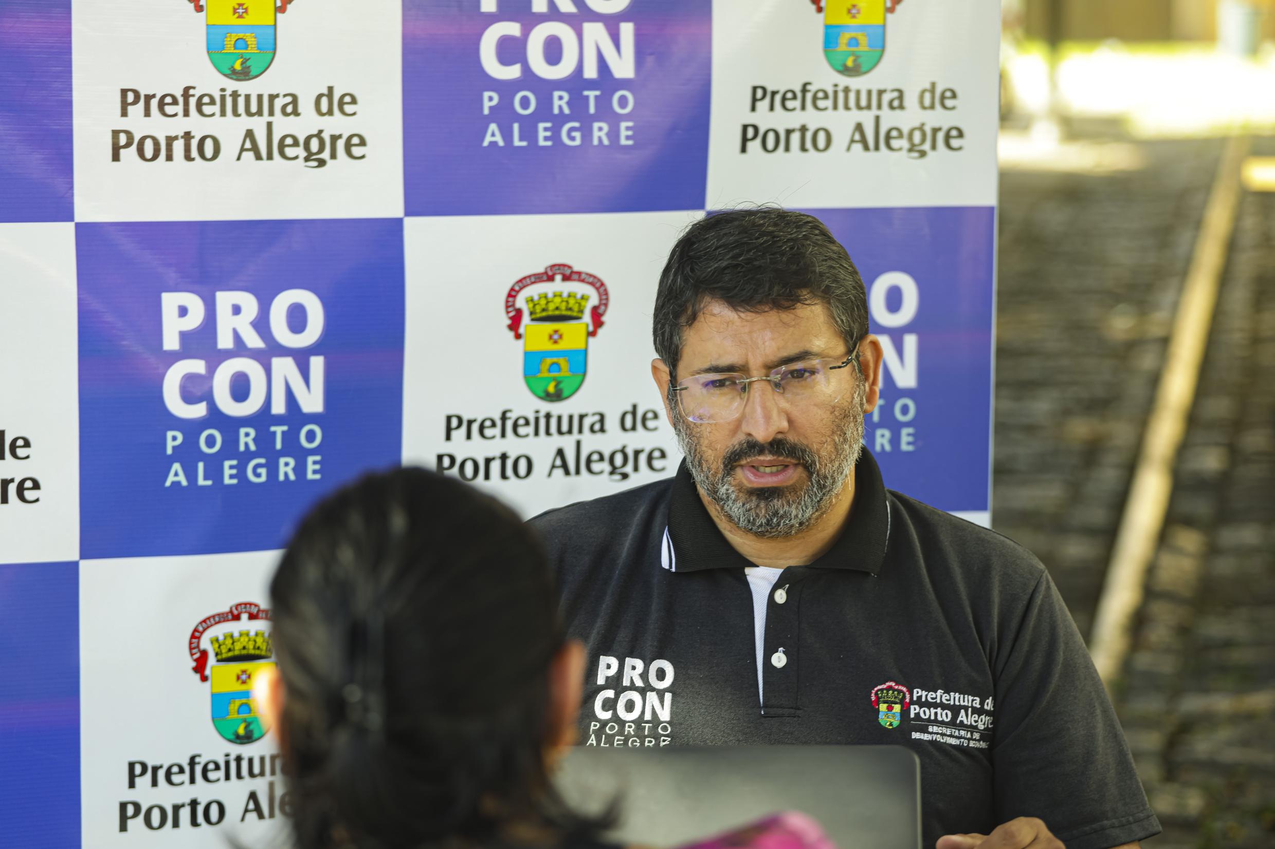 Porto Alegre, RS, Brasil, 16/03/2026: A Prefeitura de Porto Alegre promove nesta segunda-feira, 16, um mutirão de atendimento ao consumidor no Largo Glênio Peres, ao lado do Mercado Público, no Centro Histórico. A ação ocorre das 10h às 16h e é alusiva ao Dia do Consumidor, celebrado em março. A iniciativa, da Secretaria Municipal de Transparência e Controladoria (SMTC) e do Procon Porto Alegre, reunirá serviços voltados à orientação e ao atendimento direto à população. Foto: Alex Rocha/PMPA
