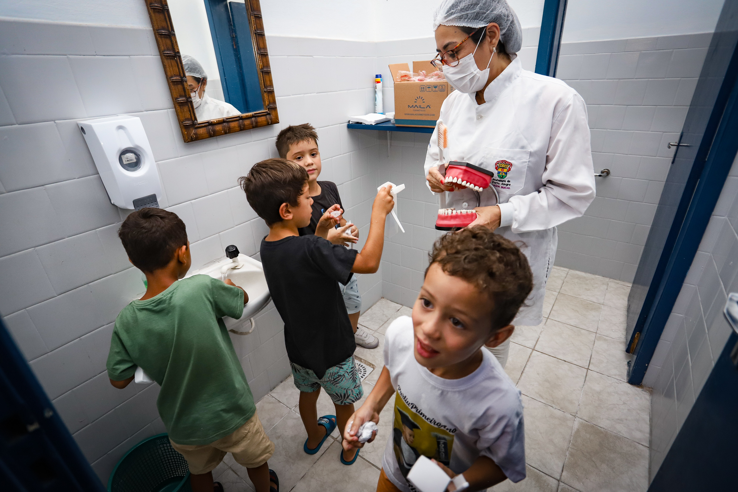 A equipe de saúde bucal da US Modelo realizou atividade na Escola Estadual Duque de Caxias (rua General Caldwell, 1175, Azenha), atendendo alunos do 1º ao 3º ano do Ensino Fundamental. Os profissionais promoveram orientações educativas com o uso de manequins odontológicos (bocão), realizaram escovação supervisionada e distribuíram kits de higiene bucal com escova de dentes, pasta e fio dental. Foram também feitas avaliações clínicas individuais para identificar necessidades de tratamento, com encaminhamento para o consultório odontológico da unidade de saúde. Foto: Cristine Rochol/PMPA