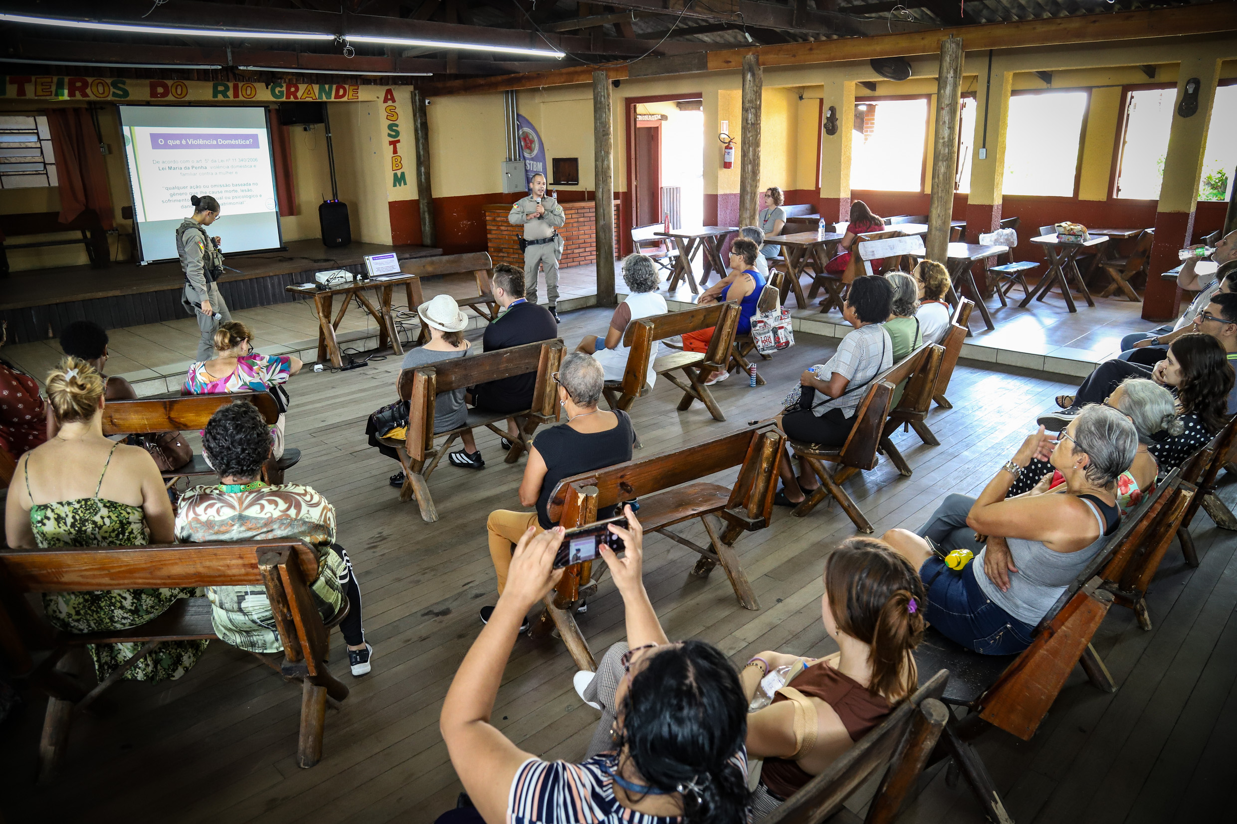 A Roda de Conversa sobre a Prevenção à Violência Doméstica reuniu as usuárias do grupo de convivência Bem Viver, da Unidade de Saúde Bananeiras, para uma palestra conduzida pelos oficiais da Patrulha Maria da Penha da Brigada Militar. Promovida pela equipe eMulti SUS da unidade, a atividade integrou as ações em alusão ao Dia Internacional da Mulher, promovendo o fortalecimento da rede de proteção e estreitando o diálogo entre a comunidade e os serviços públicos. O encontro, que consolidou um espaço de acolhimento e orientação especializada, ocorreu no Clube de Tenentes e Sargentos da Brigada Militar, no bairro Partenon. Foto: Cristine Rochol/PMPA