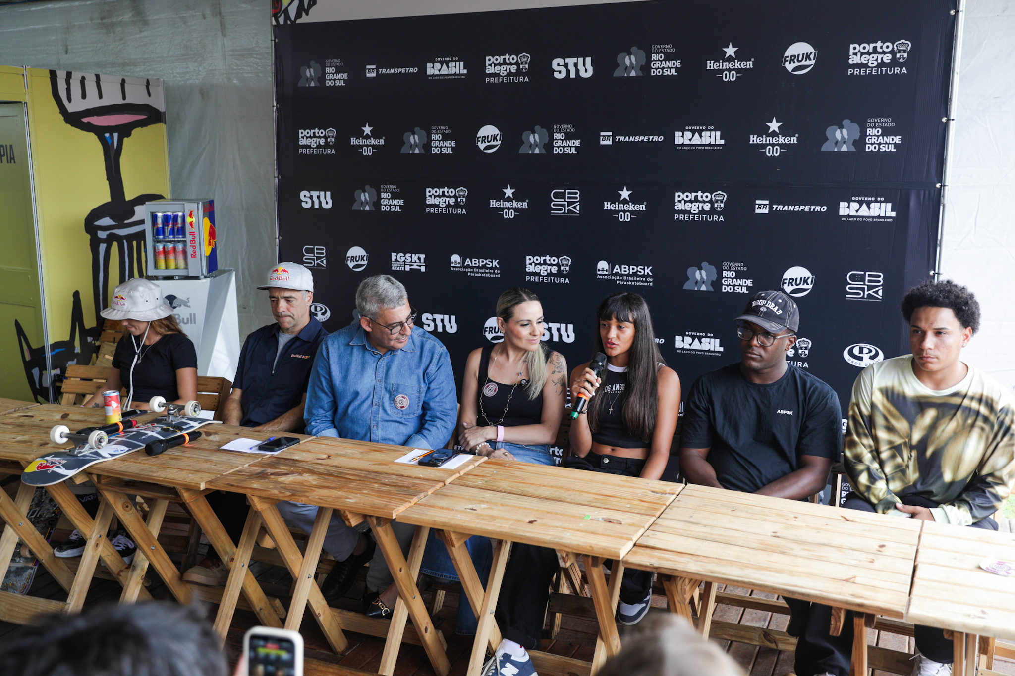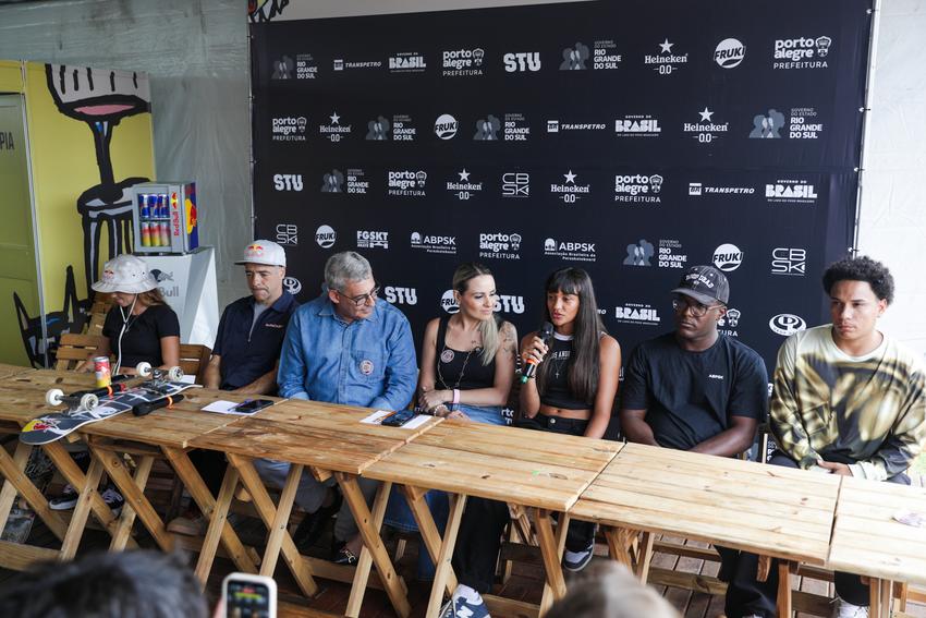 Porto Alegre, RS, 19/3/2026 - Nesta quinta-feira, 19, às 11h, aconteceu a coletiva de imprensa do STU National 2026 – Etapa Porto Alegre, no complexo de skate do trecho 3 da Orla do Guaíba. Além do prefeito Sebastião Melo, participaram do encontro os skatistas Sandro Dias, representante dos Superstars; e Yndiara Asp, da modalidade Park; João Lucas Alves e Maria Lúcia, do Street; e o paraskatista Tony Alves. Fotos: Pedro Piegas / PMPA