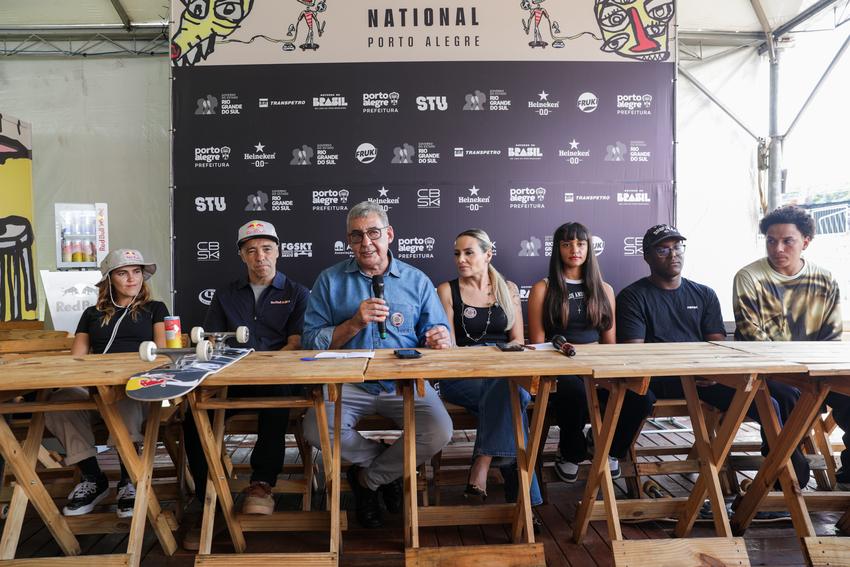 Porto Alegre, RS, 19/3/2026 - Nesta quinta-feira, 19, às 11h, aconteceu a coletiva de imprensa do STU National 2026 – Etapa Porto Alegre, no complexo de skate do trecho 3 da Orla do Guaíba. Além do prefeito Sebastião Melo, participaram do encontro os skatistas Sandro Dias, representante dos Superstars; e Yndiara Asp, da modalidade Park; João Lucas Alves e Maria Lúcia, do Street; e o paraskatista Tony Alves. Fotos: Pedro Piegas / PMPA