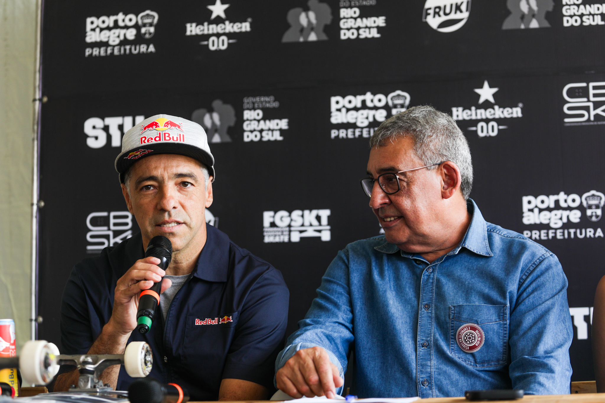 Porto Alegre, RS, 19/3/2026 - Nesta quinta-feira, 19, às 11h, aconteceu a coletiva de imprensa do STU National 2026 – Etapa Porto Alegre, no complexo de skate do trecho 3 da Orla do Guaíba. Além do prefeito Sebastião Melo, participaram do encontro os skatistas Sandro Dias, representante dos Superstars; e Yndiara Asp, da modalidade Park; João Lucas Alves e Maria Lúcia, do Street; e o paraskatista Tony Alves. Fotos: Pedro Piegas / PMPA