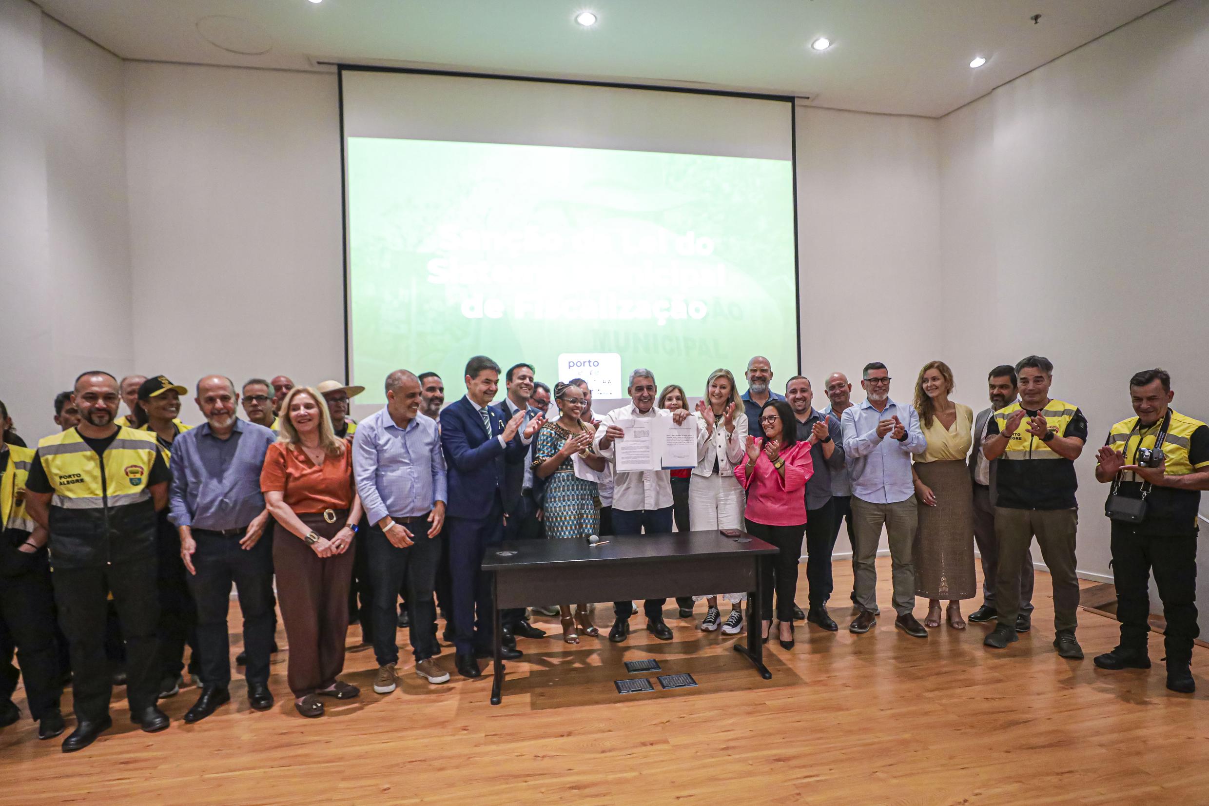 Porto Alegre, RS, Brasil, 20/03/2026: O prefeito Sebastião Melo sancionou nesta sexta-feira, 20, durante solenidade no Auditório da Aiamu (rua dos Andradas, 1.234, 8º andar, bloco B, bairro Centro Histórico), a lei que institui o Sistema Municipal de Fiscalização. O ato marca um passo importante na modernização da gestão pública, com foco na integração das ações de fiscalização, aumento da eficiência operacional e qualificação do atendimento à população em Porto Alegre. Aprovada pela Câmara Municipal em fevereiro, a nova legislação reorganiza e padroniza as atividades fiscalizatórias no município, unificando estruturas e criando uma nova carreira de Agente de Fiscalização Municipal. Foto: Alex Rocha/PMPA