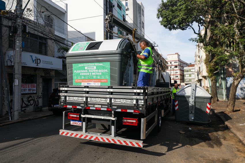 Porto Alegre, RS, 23/3/2026 - A partir da segunda-feira, 23, o Departamento Municipal de Limpeza Urbana (DMLU) iniciou a substituição dos contêineres da Coleta Seletiva no bairro Cidade Baixa. Os atuais equipamentos de plástico, na cor verde, foram substituídos por 90 contêineres metálicos, mais resistentes, no modelo com tampa fixa e abertura no formato boca de lobo. Fotos: Pedro Piegas / PMPA