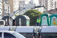 Porto Alegre, RS, 23/3/2026 - A partir da segunda-feira, 23, o Departamento Municipal de Limpeza Urbana (DMLU) iniciou a substituição dos contêineres da Coleta Seletiva no bairro Cidade Baixa. Os atuais equipamentos de plástico, na cor verde, foram substituídos por 90 contêineres metálicos, mais resistentes, no modelo com tampa fixa e abertura no formato boca de lobo. Fotos: Pedro Piegas / PMPA