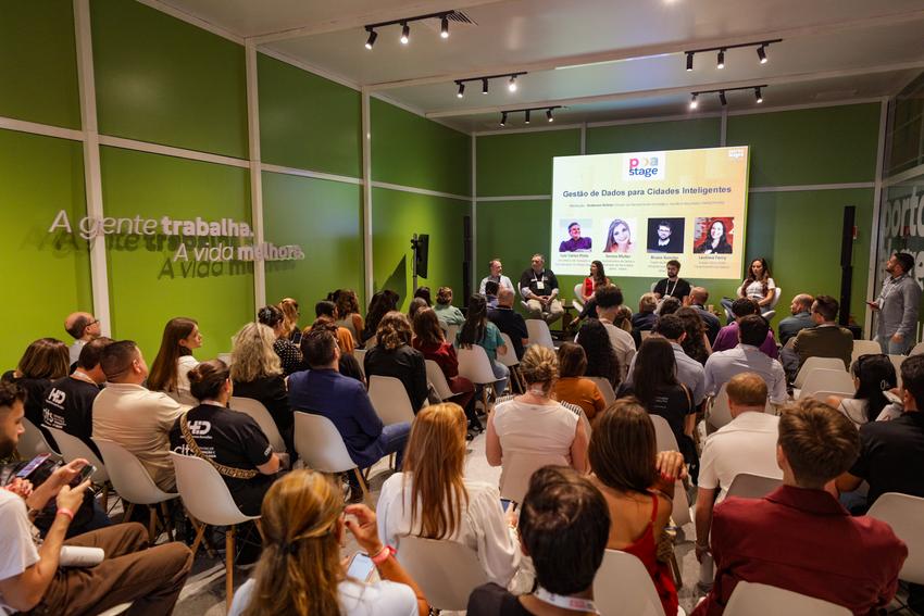 Porto Alegre, RS, 25/03/2026 - Painel: Gestão de Dados para Cidades Inteligentes no POA STAGE no South Summit Brazil 2026. Mediação: Anderson Bohrer (Diretor de Planejamento Estratégico, Gestão e Resultados SMPG/PMPA). Painelistas: Luiz Carlos Pinto - Secretário de Inovação e Coordenador do Pacto Alegre; Sonise Muller - Coordenadora de Dados e Avaliação de Resultados/SMPG/PMPA; Bruno Kunzler - Coach da Bloomberg Philanthropies City Data Alliance; Lavinea Ferry - Espaço TEIA CAIXA - Caixa Econômica Federal. Fotos: Pedro Piegas / PMPA