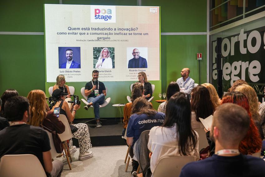 Porto Alegre, RS, 26/03/2026 - Painel: Quem está traduzindo a inovação? Como evitar que a comunicação ineficaz se torne um gargalo. Mediação: Camila Dilélio (Comunica+/PACTO ALEGRE) Painelistas: Luiz Otávio Prates - Secretário de Comunicação/PMPA; Marta Gleich - Diretora Executiva Jornalismo/GRUPO RBS; Ricardo Gomes - Head de Articulação e Comunicação-PACTO ALEGRE/House of Creativity. Fotos: Pedro Piegas / PMPA