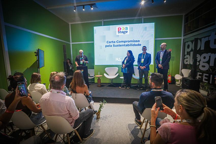 Porto Alegre, RS, Brasil, 27/03/2026: Na manhã desta sexta-feira (27), no espaço Poa Stage do South Summit Brazil 2026, foi realizado o ato de lançamento do Projeto de Lei do Programa de Logística Sustentável e a assinatura da Carta-compromisso pela Sustentabilidade. Foto: Alex Rocha/PMPA