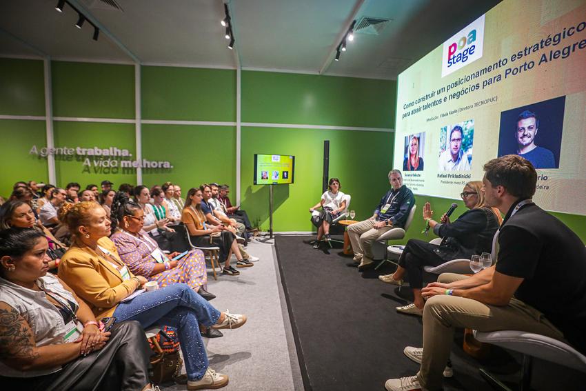 Porto Alegre, RS, Brasil, 27/03/2026: Na manhã desta sexta-feira (27), no espaço Poa Stage do South Summit Brazil 2026, foi realizado o painel Como construir um posicionamento estratégico para atrair talentos para Porto Alegre. Foto: Alex Rocha/PMPA