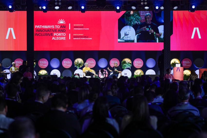 Porto Alegre, RS, 27/03/2026 - Palestra do prefeito de Porto Alegre, Sebastião Melo; e Jorge Audy, uperintendente de Inovação e Desenvolvimento da PUCRS e do TECNOPUC na Arena Stage no South Summit Brazil 2026. Fotos: Pedro Piegas / PMPA