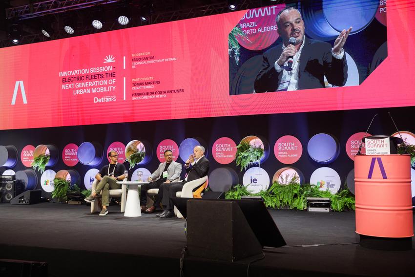 Porto Alegre, RS, 27/03/2026 - Veículos elétricos: A nova geração da mobilidade urbana - Alexandre Baldi (BYD Brasil) e Tomás Martins (Tem Bici) na Arena Stage no South Summit Brazil 2026. Fotos: Pedro Piegas / PMPA