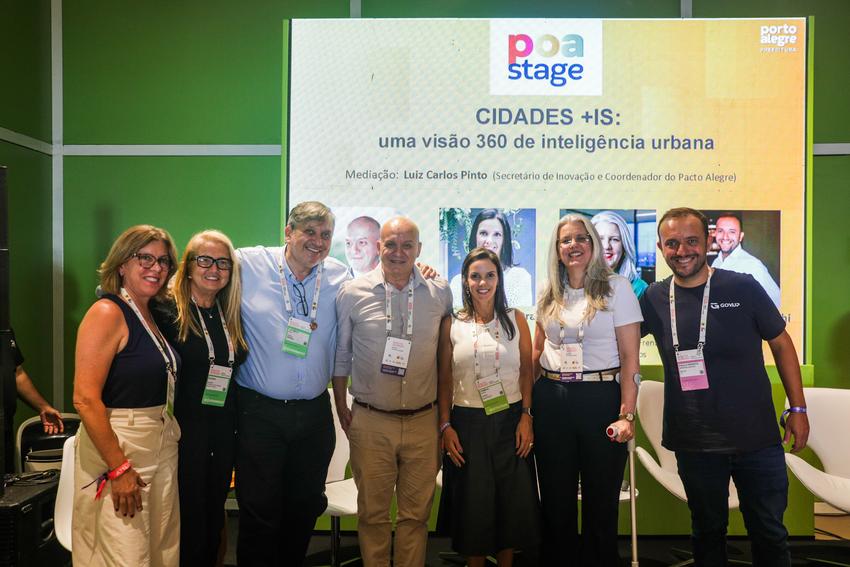 Porto Alegre, RS, 27/03/2026 - Painel: Cidades +IS: uma visão 360 de inteligência urbana no POA STAGE no South Summit Brazil 2026. Mediação: Luiz Carlos Pinto (Secretário de Inovação/PMPA e Coordenador do PACTO ALEGRE). Painelistas: Yuri Rafael Della Giustina - Diretor do Departamento de Adaptação das Cidades à Transformação Digital/Min Cidades; Camila Costa Dutra - Professora UFRGS/Coordenadora Projeto Cidades+IS; Larissa Junckes - Prefeitura Municipal de Canoas/Fórum de PPPs-Frente Nacional dos Prefeitos; Paulo Renato Ardenghi - CEO GOV.UP. Fotos: Pedro Piegas / PMPA