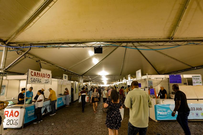 Porto Alegre, RS, Brasil, 31/03/2026: A 246ª Feira do Peixe de Porto Alegre terá o maior número de expositores já registrado desde que a prefeitura assumiu a organização do evento, com 51 bancas. No Largo Jornalista Glênio Peres, no Centro Histórico, a comercialização ocorrerá a partir desta segunda-feira, 30, até sexta-feira, 3, com horários ampliados - de segunda a quarta, das 8h às 22h, quinta-feira, das 8h à meia-noite e na sexta, das 8h às 13h. Outras regiões também receberão a feira, como a Esplanada da Restinga e o bairro Belém Novo, ampliando o acesso da população ao pescado. Foto: Nathally Borowsky/PMPA