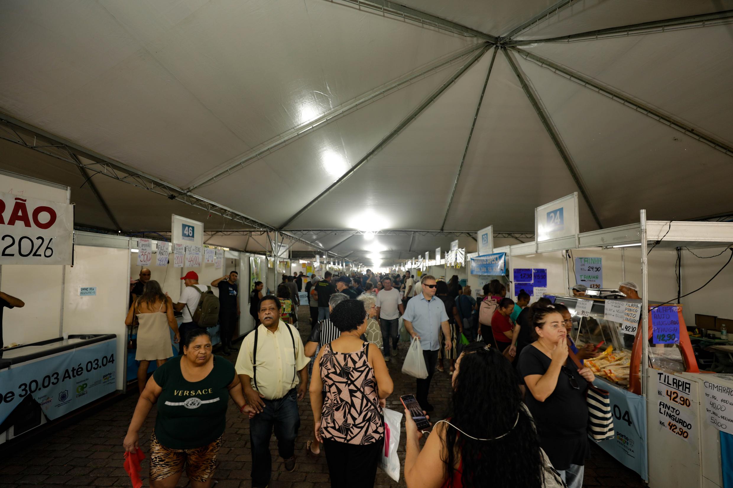 Porto Alegre, RS, Brasil, 31/03/2026: A 246ª Feira do Peixe de Porto Alegre terá o maior número de expositores já registrado desde que a prefeitura assumiu a organização do evento, com 51 bancas. No Largo Jornalista Glênio Peres, no Centro Histórico, a comercialização ocorrerá a partir desta segunda-feira, 30, até sexta-feira, 3, com horários ampliados - de segunda a quarta, das 8h às 22h, quinta-feira, das 8h à meia-noite e na sexta, das 8h às 13h. Outras regiões também receberão a feira, como a Esplanada da Restinga e o bairro Belém Novo, ampliando o acesso da população ao pescado. Foto: Nathally Borowsky/PMPA