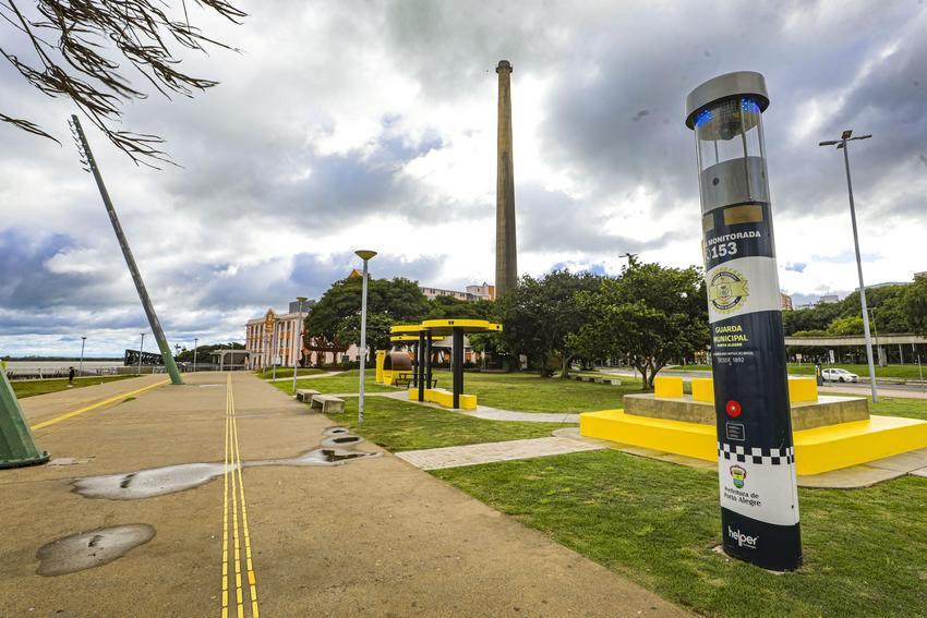 Porto Alegre, RS, Brasil, 07/4/2026: A capital tem treze totens de segurança instalados em regiões de grande fluxo de pessoas. Cada equipamento tem quatro metros de altura e é equipado com três câmeras de videomonitoramento, com cobertura de 360º em imagens. O objetivo é facilitar o acesso da população aos serviços de segurança e saúde, em casos de emergências. Por meio de um botão, é acionada a central de atendimento. Foto: Alex Rocha/PMPA