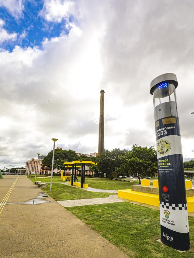 Porto Alegre, RS, Brasil, 07/4/2026: A capital tem treze totens de segurança instalados em regiões de grande fluxo de pessoas. Cada equipamento tem quatro metros de altura e é equipado com três câmeras de videomonitoramento, com cobertura de 360º em imagens. O objetivo é facilitar o acesso da população aos serviços de segurança e saúde, em casos de emergências. Por meio de um botão, é acionada a central de atendimento. Foto: Alex Rocha/PMPA