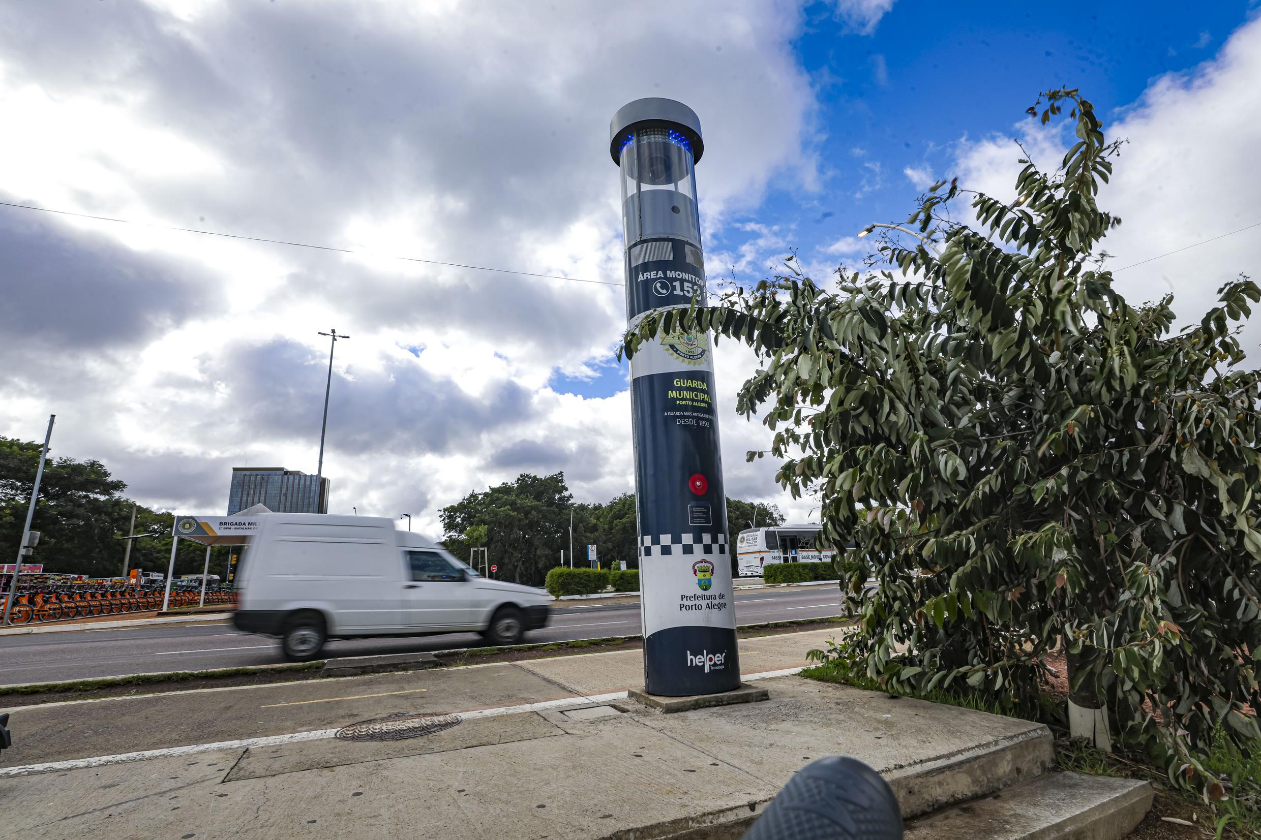 Porto Alegre, RS, Brasil, 07/4/2026: A capital tem treze totens de segurança instalados em regiões de grande fluxo de pessoas. Cada equipamento tem quatro metros de altura e é equipado com três câmeras de videomonitoramento, com cobertura de 360º em imagens. O objetivo é facilitar o acesso da população aos serviços de segurança e saúde, em casos de emergências. Por meio de um botão, é acionada a central de atendimento. Foto: Alex Rocha/PMPA