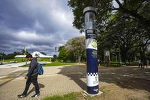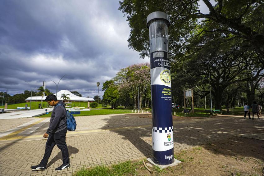 Porto Alegre, RS, Brasil, 07/4/2026: A capital tem treze totens de segurança instalados em regiões de grande fluxo de pessoas. Cada equipamento tem quatro metros de altura e é equipado com três câmeras de videomonitoramento, com cobertura de 360º em imagens. O objetivo é facilitar o acesso da população aos serviços de segurança e saúde, em casos de emergências. Por meio de um botão, é acionada a central de atendimento. Foto: Alex Rocha/PMPA