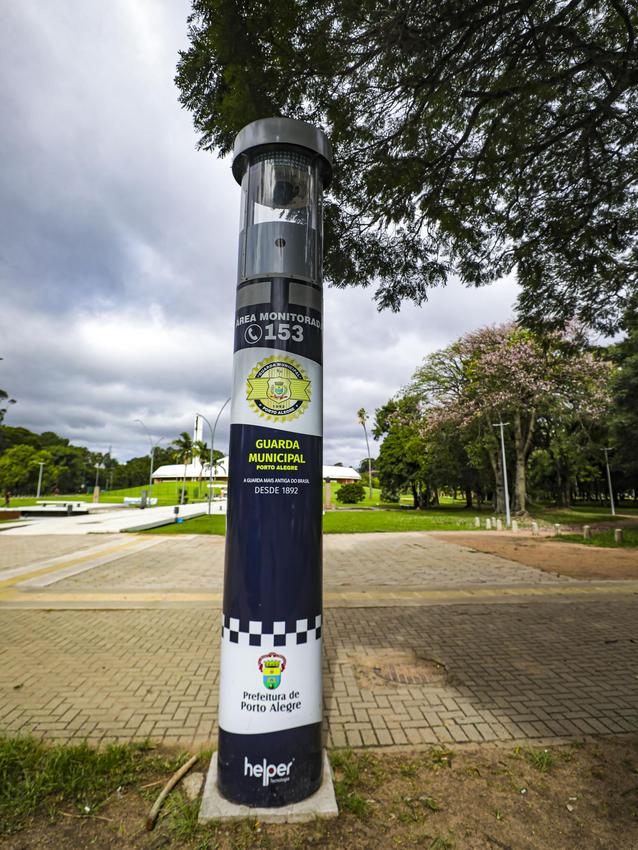 Porto Alegre, RS, Brasil, 07/4/2026: A capital tem treze totens de segurança instalados em regiões de grande fluxo de pessoas. Cada equipamento tem quatro metros de altura e é equipado com três câmeras de videomonitoramento, com cobertura de 360º em imagens. O objetivo é facilitar o acesso da população aos serviços de segurança e saúde, em casos de emergências. Por meio de um botão, é acionada a central de atendimento. Foto: Alex Rocha/PMPA
