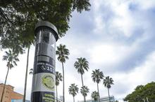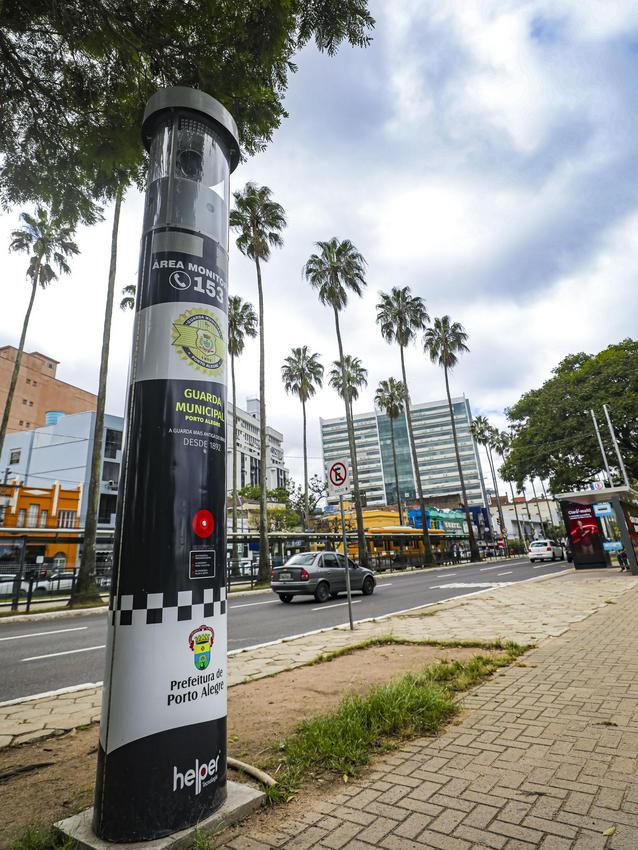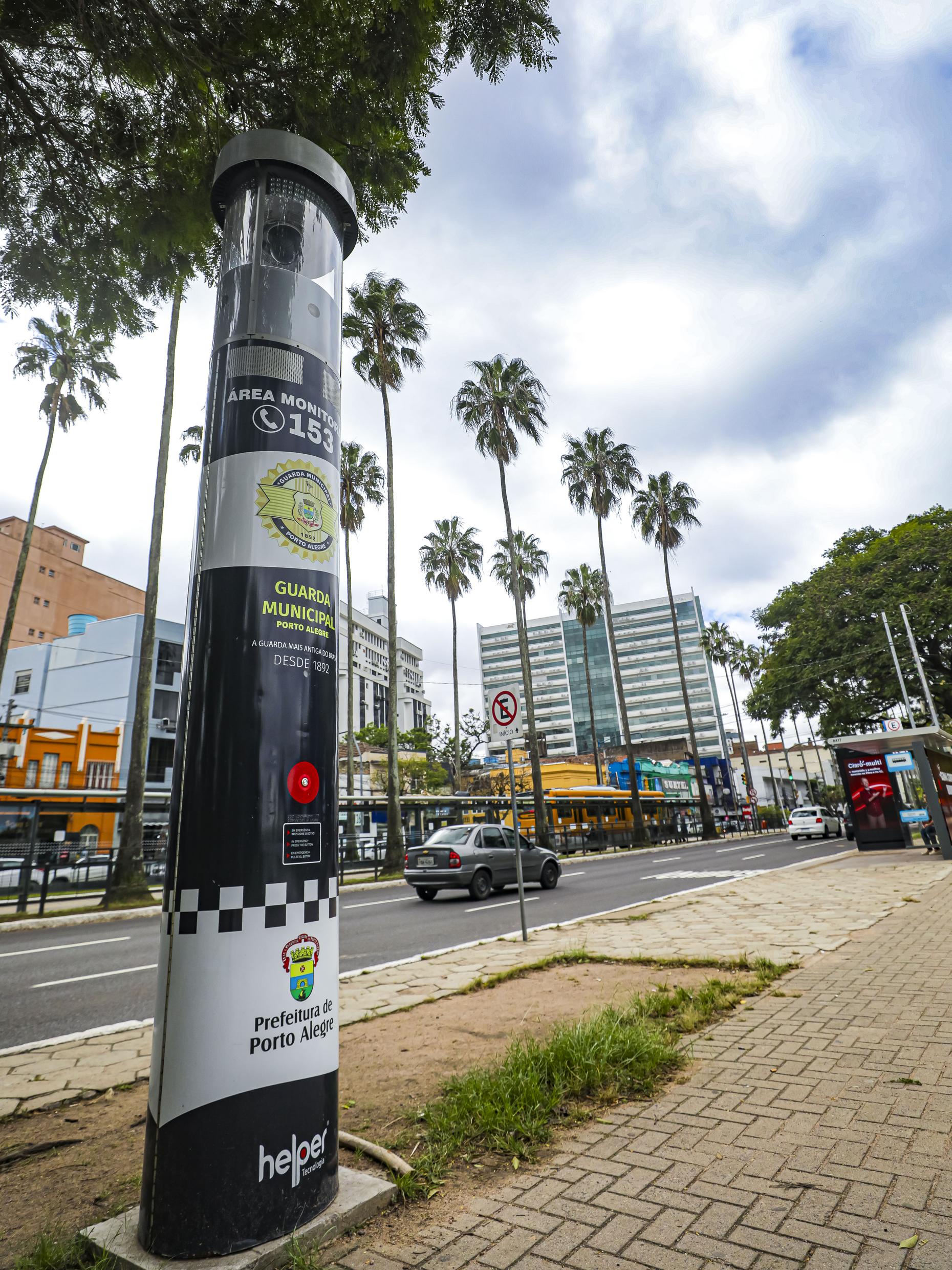 Porto Alegre, RS, Brasil, 07/4/2026: A capital tem treze totens de segurança instalados em regiões de grande fluxo de pessoas. Cada equipamento tem quatro metros de altura e é equipado com três câmeras de videomonitoramento, com cobertura de 360º em imagens. O objetivo é facilitar o acesso da população aos serviços de segurança e saúde, em casos de emergências. Por meio de um botão, é acionada a central de atendimento. Foto: Alex Rocha/PMPA