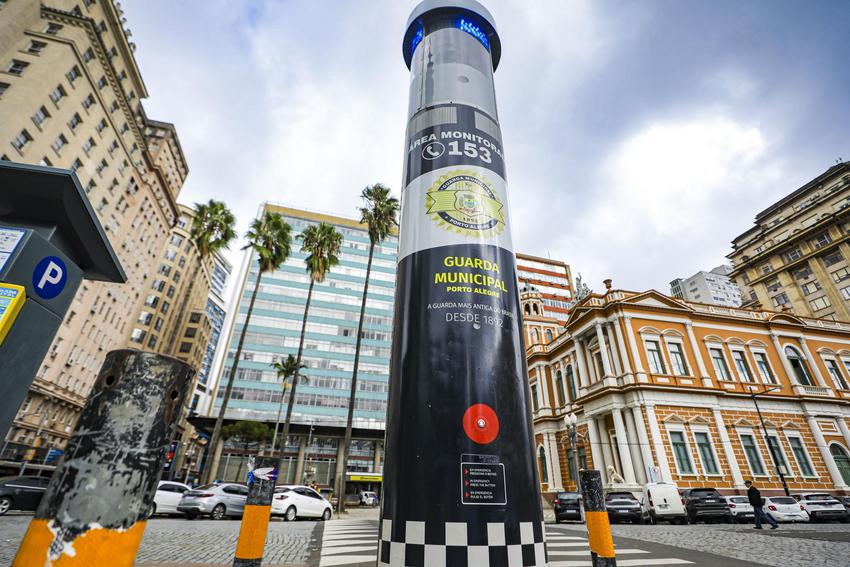 Porto Alegre, RS, Brasil, 07/4/2026: A capital tem treze totens de segurança instalados em regiões de grande fluxo de pessoas. Cada equipamento tem quatro metros de altura e é equipado com três câmeras de videomonitoramento, com cobertura de 360º em imagens. O objetivo é facilitar o acesso da população aos serviços de segurança e saúde, em casos de emergências. Por meio de um botão, é acionada a central de atendimento. Foto: Alex Rocha/PMPA