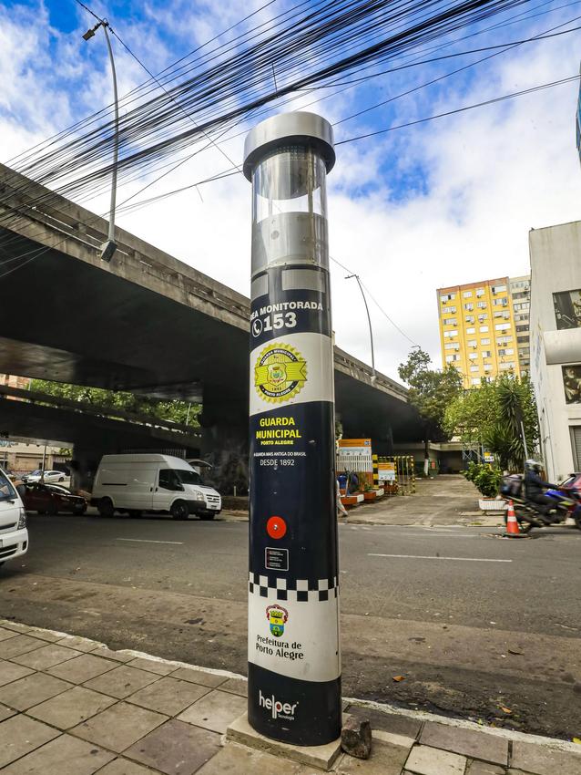 Porto Alegre, RS, Brasil, 07/4/2026: A capital tem treze totens de segurança instalados em regiões de grande fluxo de pessoas. Cada equipamento tem quatro metros de altura e é equipado com três câmeras de videomonitoramento, com cobertura de 360º em imagens. O objetivo é facilitar o acesso da população aos serviços de segurança e saúde, em casos de emergências. Por meio de um botão, é acionada a central de atendimento. Foto: Alex Rocha/PMPA