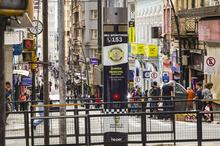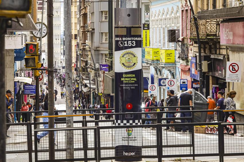Porto Alegre, RS, Brasil, 07/4/2026: A capital tem treze totens de segurança instalados em regiões de grande fluxo de pessoas. Cada equipamento tem quatro metros de altura e é equipado com três câmeras de videomonitoramento, com cobertura de 360º em imagens. O objetivo é facilitar o acesso da população aos serviços de segurança e saúde, em casos de emergências. Por meio de um botão, é acionada a central de atendimento. Foto: Alex Rocha/PMPA