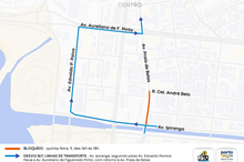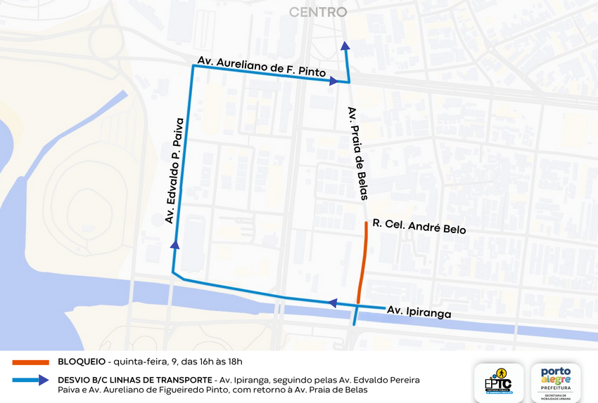 Porto Alegre, RS, 08/04/2026 - Mapa com o bloqueio total da avenida Praia de Belas, entre a avenida Ipiranga e a rua Coronel André Belo, nesta quinta-feira, 9, das 16h às 18h, com o desvio do transporte público durante o período. O bloqueio foi solicitado pelo 9º Batalhão de Polícia Militar, da Brigada Militar, para a passagem de comando da corporação na região. Arte: Carlos Rohde/EPTC/PMPA