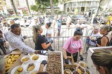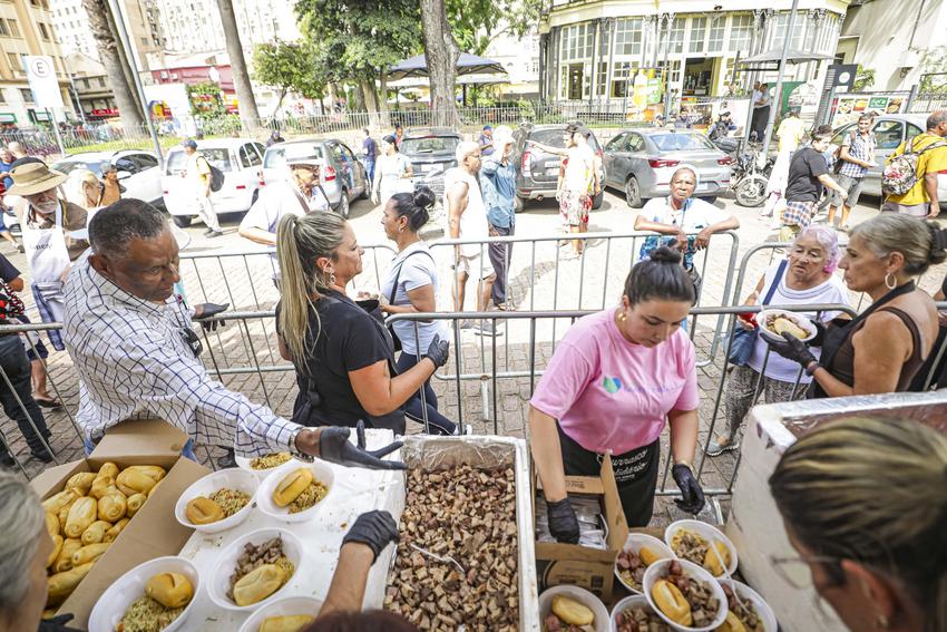 Porto Alegre, RS, Brasil, 15/4/2026: Nesta quarta-feira, 15, a partir das 12h, ocorreu o tradicional Assado e Paella Solidária no Largo Glênio Peres. Foram distribuídos 1.250 quilos de carne e 900 quilos de paella gaúcha, acompanhados de pão, refrigerante e água. O chef de cozinha e coordenador dos assadores foi René Barbachan, tradicionalista, cozinheiro, assador e patrono do Acampamento Farroupilha de Porto Alegre em 2025, juntamente com José Roberto Maraschin. A atividade foi gratuita, contou com diversas atrações musicais, como a Banda da Brigada Militar, Fábrica de Gaiteiros, de Borguetinho, com apresentação de músicas gauchescas, além de pagode e samba. Elmer Fagundes e Marcelo Cachoeira também se apresentam em parceria com a Secretaria Municipal da Cultura. Foto: Alex Rocha/PMPA