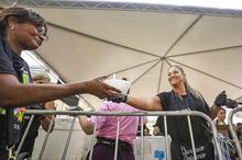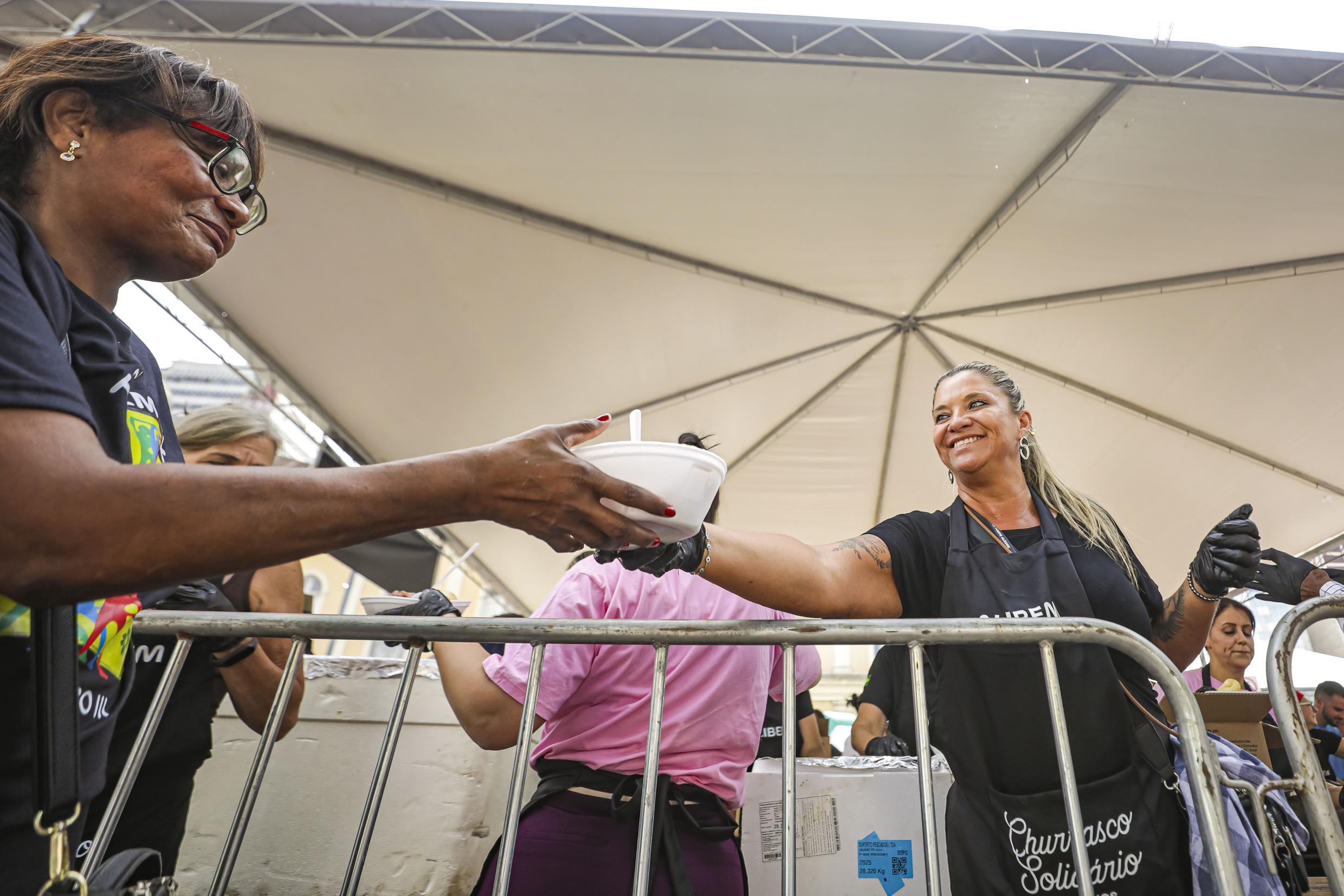 Porto Alegre, RS, Brasil, 15/4/2026: Nesta quarta-feira, 15, a partir das 12h, ocorreu o tradicional Assado e Paella Solidária no Largo Glênio Peres. Foram distribuídos 1.250 quilos de carne e 900 quilos de paella gaúcha, acompanhados de pão, refrigerante e água. O chef de cozinha e coordenador dos assadores foi René Barbachan, tradicionalista, cozinheiro, assador e patrono do Acampamento Farroupilha de Porto Alegre em 2025, juntamente com José Roberto Maraschin. A atividade foi gratuita, contou com diversas atrações musicais, como a Banda da Brigada Militar, Fábrica de Gaiteiros, de Borguetinho, com apresentação de músicas gauchescas, além de pagode e samba. Elmer Fagundes e Marcelo Cachoeira também se apresentam em parceria com a Secretaria Municipal da Cultura. Foto: Alex Rocha/PMPA