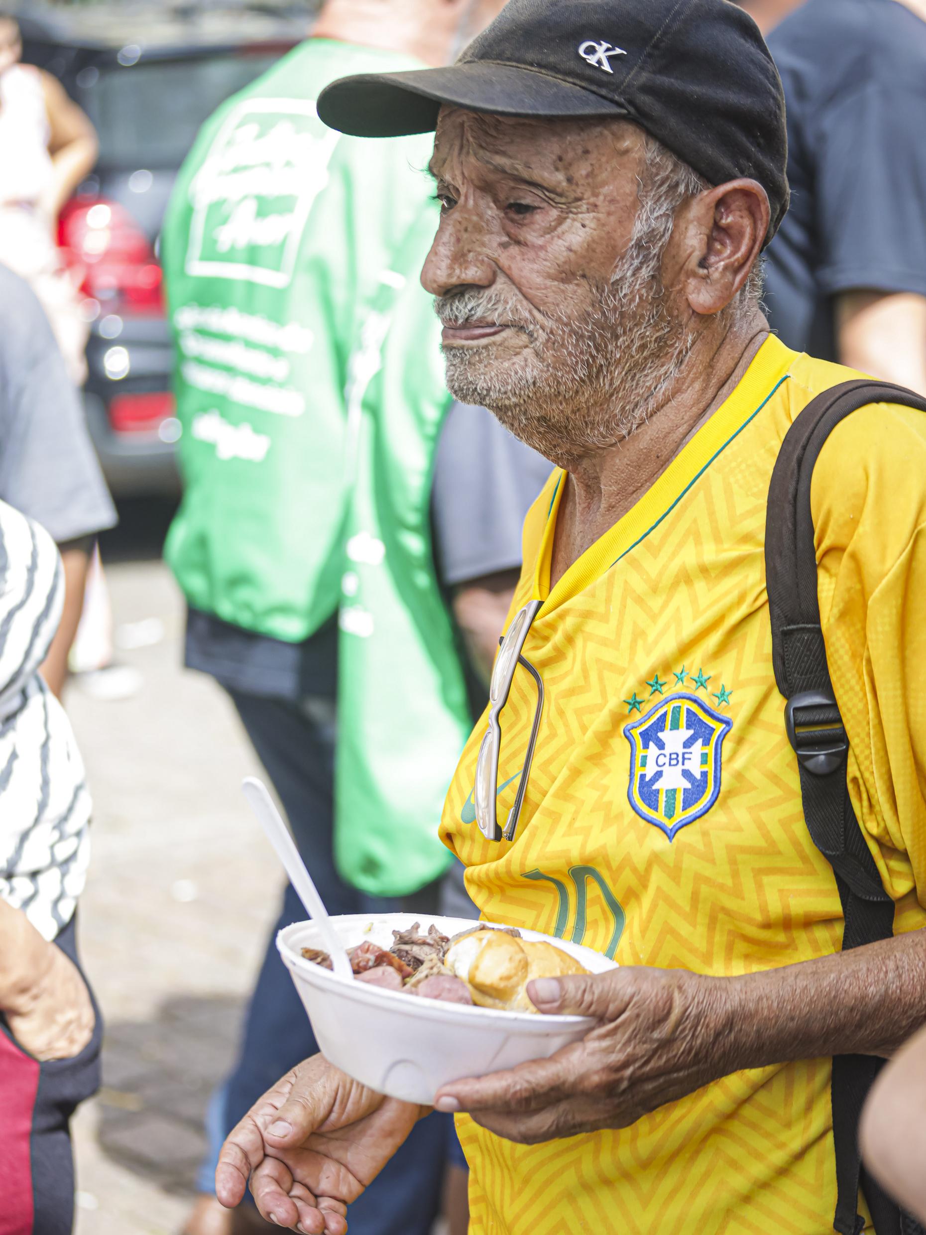 Porto Alegre, RS, Brasil, 15/4/2026: Nesta quarta-feira, 15, a partir das 12h, ocorreu o tradicional Assado e Paella Solidária no Largo Glênio Peres. Foram distribuídos 1.250 quilos de carne e 900 quilos de paella gaúcha, acompanhados de pão, refrigerante e água. O chef de cozinha e coordenador dos assadores foi René Barbachan, tradicionalista, cozinheiro, assador e patrono do Acampamento Farroupilha de Porto Alegre em 2025, juntamente com José Roberto Maraschin. A atividade foi gratuita, contou com diversas atrações musicais, como a Banda da Brigada Militar, Fábrica de Gaiteiros, de Borguetinho, com apresentação de músicas gauchescas, além de pagode e samba. Elmer Fagundes e Marcelo Cachoeira também se apresentam em parceria com a Secretaria Municipal da Cultura. Foto: Alex Rocha/PMPA