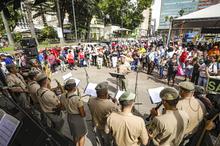 Porto Alegre, RS, Brasil, 15/4/2026: Nesta quarta-feira, 15, a partir das 12h, ocorreu o tradicional Assado e Paella Solidária no Largo Glênio Peres. Foram distribuídos 1.250 quilos de carne e 900 quilos de paella gaúcha, acompanhados de pão, refrigerante e água. O chef de cozinha e coordenador dos assadores foi René Barbachan, tradicionalista, cozinheiro, assador e patrono do Acampamento Farroupilha de Porto Alegre em 2025, juntamente com José Roberto Maraschin. A atividade foi gratuita, contou com diversas atrações musicais, como a Banda da Brigada Militar, Fábrica de Gaiteiros, de Borguetinho, com apresentação de músicas gauchescas, além de pagode e samba. Elmer Fagundes e Marcelo Cachoeira também se apresentam em parceria com a Secretaria Municipal da Cultura. Foto: Alex Rocha/PMPA