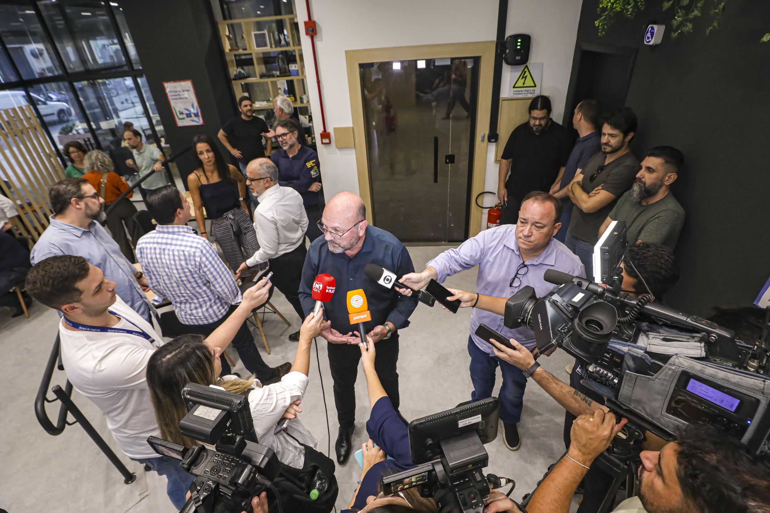 Porto Alegre, RS, Brasil, 15/4/2026: A Prefeitura de Porto Alegre apresentou nesta quarta-feira, 15, o Mobi+ Porto Alegre, novo aplicativo de mobilidade urbana. O lançamento ocorreu no Procempa SmartLab, localizado na rua General João Manoel, 157, bairro Centro Histórico. Baseado no conceito de MaaS (Mobility as a Service), o aplicativo integra, em uma única plataforma, diferentes opções de deslocamento em tempo real. A ferramenta reúne alternativas de transporte público e individual, como ônibus, patinetes, táxis, bicicletas compartilhadas e trajetos a pé, facilitando o planejamento de viagens multimodais e intermodais pela cidade. Foto: Alex Rocha/PMPA