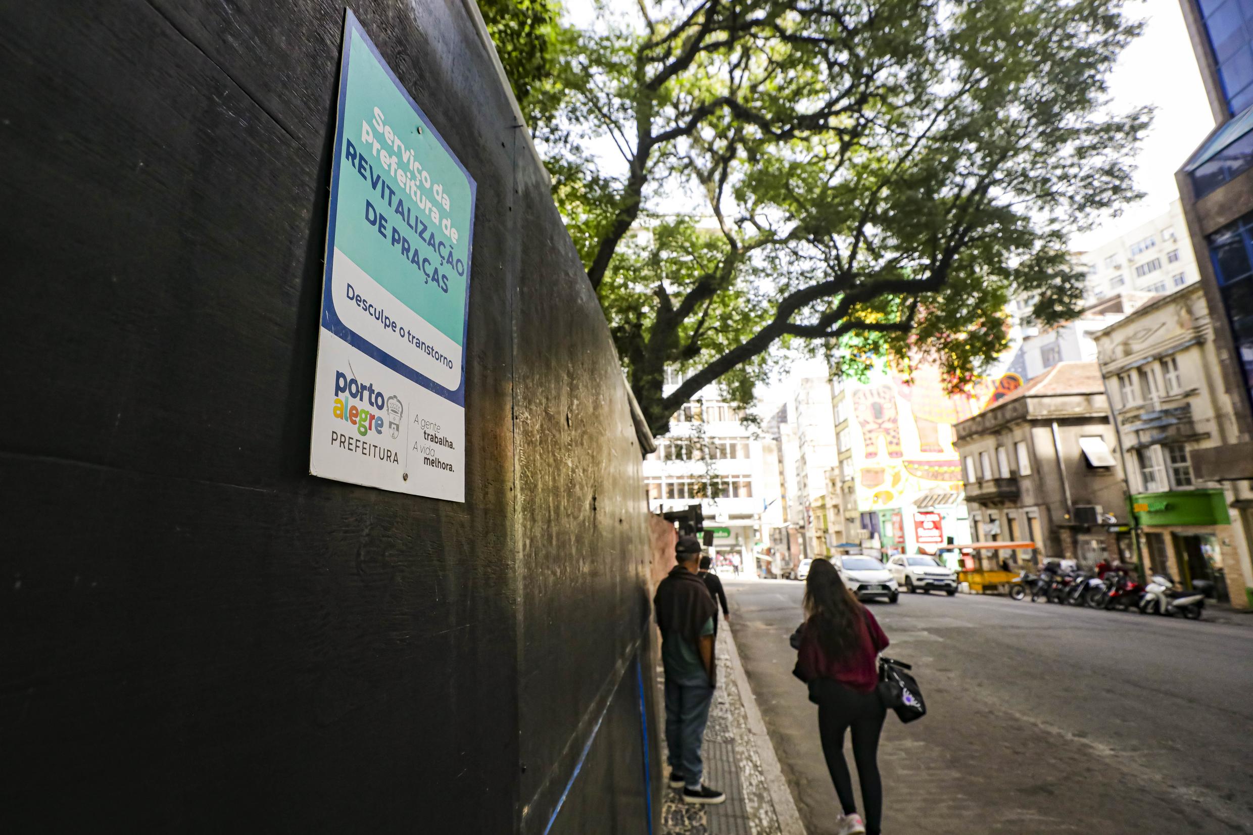 Porto Alegre, RS, Brasil, 20/4/2026: Seguem nesta segunda-feira (20), os trabalhos de revitalização da Praça Dom Feliciano, localizada no Centro Histórico e reconhecida como uma das áreas públicas mais tradicionais da Capital. A Praça integra o inventário do patrimônio cultural de Porto Alegre, o que exige a preservação de suas características originais. A revitalização inclui a recuperação dos passeios em pedra portuguesa, das muretas, meio-fio, bancos, brinquedos do playground e luminárias. Foto: Alex Rocha/PMPA