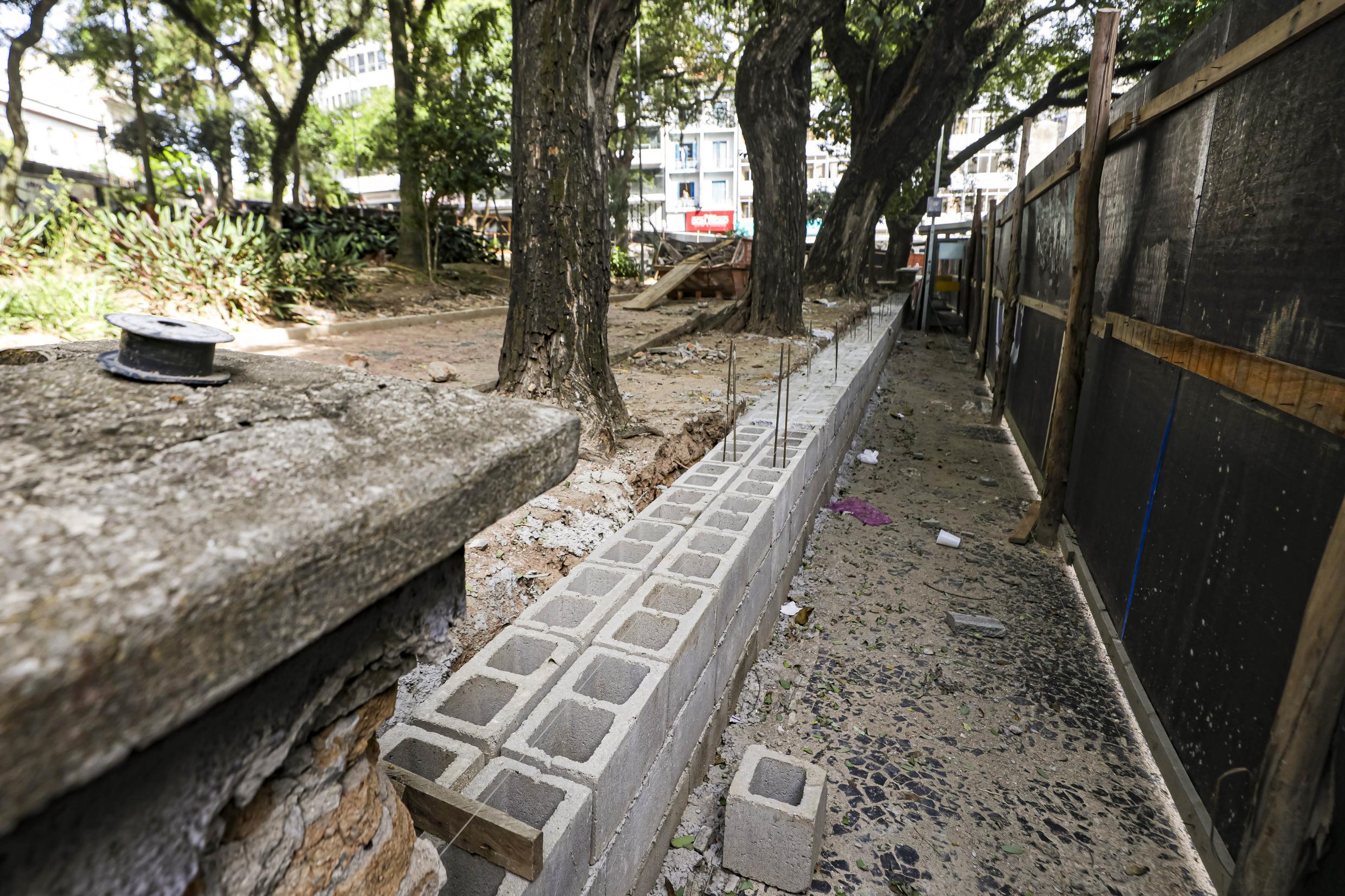Porto Alegre, RS, Brasil, 20/4/2026: Seguem nesta segunda-feira (20), os trabalhos de revitalização da Praça Dom Feliciano, localizada no Centro Histórico e reconhecida como uma das áreas públicas mais tradicionais da Capital. A Praça integra o inventário do patrimônio cultural de Porto Alegre, o que exige a preservação de suas características originais. A revitalização inclui a recuperação dos passeios em pedra portuguesa, das muretas, meio-fio, bancos, brinquedos do playground e luminárias. Foto: Alex Rocha/PMPA
