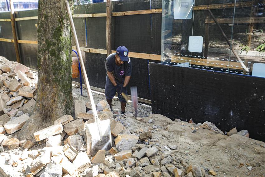 Porto Alegre, RS, Brasil, 20/4/2026: Seguem nesta segunda-feira (20), os trabalhos de revitalização da Praça Dom Feliciano, localizada no Centro Histórico e reconhecida como uma das áreas públicas mais tradicionais da Capital. A Praça integra o inventário do patrimônio cultural de Porto Alegre, o que exige a preservação de suas características originais. A revitalização inclui a recuperação dos passeios em pedra portuguesa, das muretas, meio-fio, bancos, brinquedos do playground e luminárias. Foto: Alex Rocha/PMPA