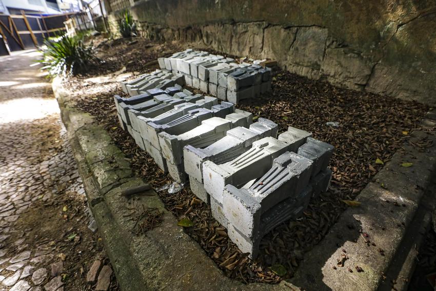 Porto Alegre, RS, Brasil, 20/4/2026: Seguem nesta segunda-feira (20), os trabalhos de revitalização da Praça Dom Feliciano, localizada no Centro Histórico e reconhecida como uma das áreas públicas mais tradicionais da Capital. A Praça integra o inventário do patrimônio cultural de Porto Alegre, o que exige a preservação de suas características originais. A revitalização inclui a recuperação dos passeios em pedra portuguesa, das muretas, meio-fio, bancos, brinquedos do playground e luminárias. Foto: Alex Rocha/PMPA