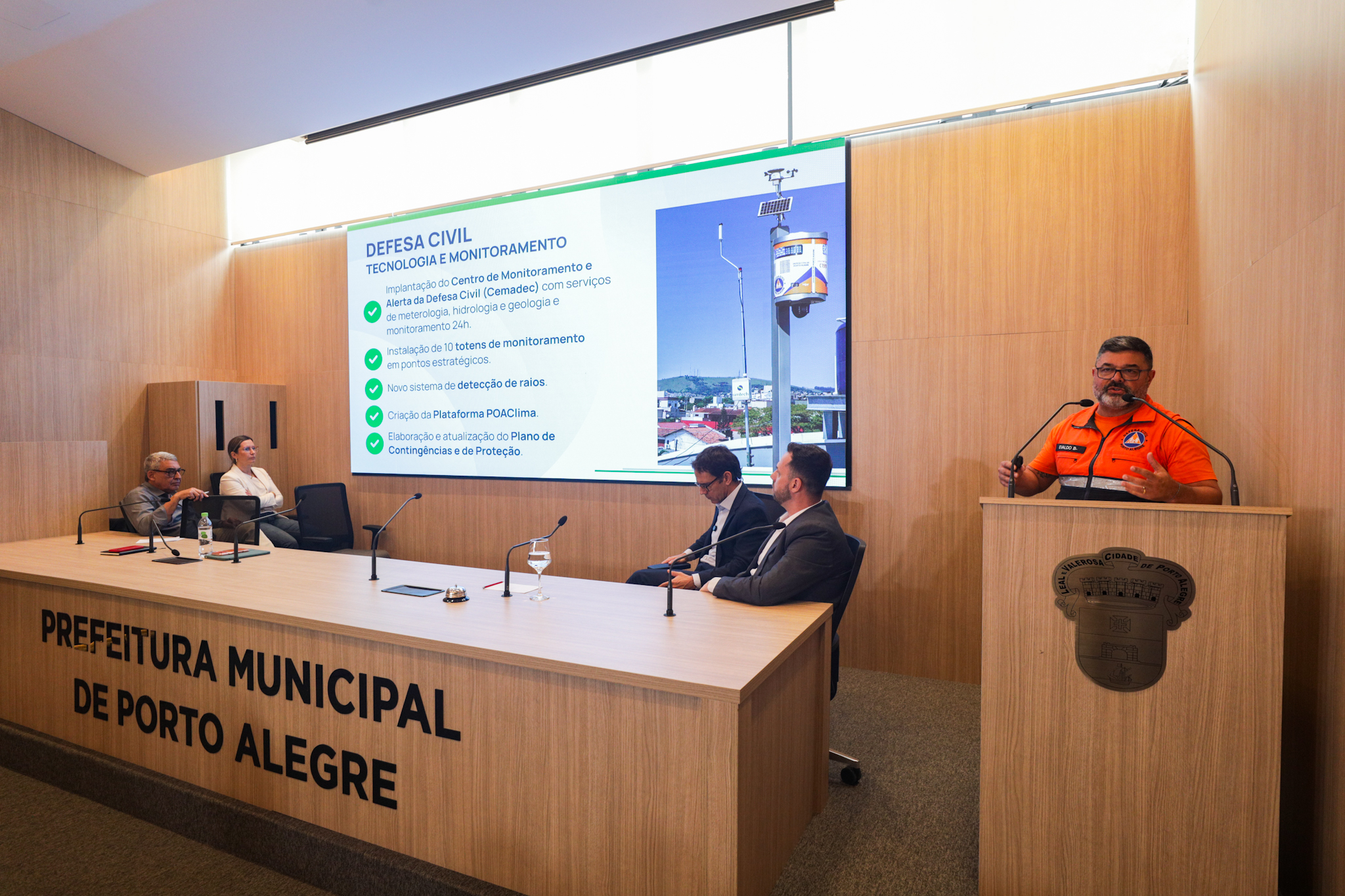 Participaram o prefeito Sebastião Melo, o diretor-geral do Departamento Municipal de Água e Esgotos (Dmae), Vicente Perrone, o coordenador da Defesa Civil Municipal, Evaldo Rodrigues de Oliveira Júnior, e a meteorologista da Catavento Meteorologia, Natália Pereira. Fotos: Pedro Piegas / PMPA. Fotos: Pedro Piegas