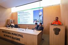 Porto Alegre, RS, 23/4/2026 - A Prefeitura de Porto Alegre realizou nesta quinta-feira, às 10h30, coletiva de imprensa para detalhar as obras e os investimentos no sistema de proteção contra cheias na Capital. Na ocasião, também foram apresentados os reforços na Defesa Civil Municipal e prognósticos atualizados do El Niño para o segundo semestre deste ano.