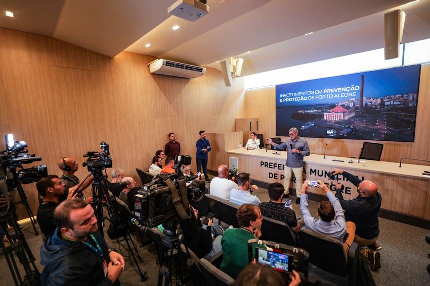 Porto Alegre, RS, 23/4/2026 - A Prefeitura de Porto Alegre realizou nesta quinta-feira, às 10h30, coletiva de imprensa para detalhar as obras e os investimentos no sistema de proteção contra cheias na Capital. Na ocasião, também foram apresentados os reforços na Defesa Civil Municipal e prognósticos atualizados do El Niño para o segundo semestre deste ano.