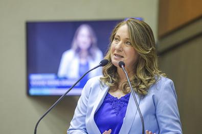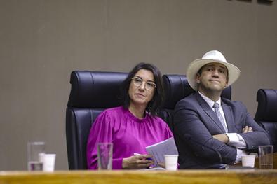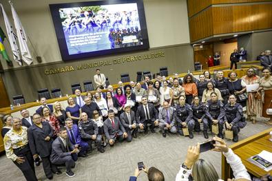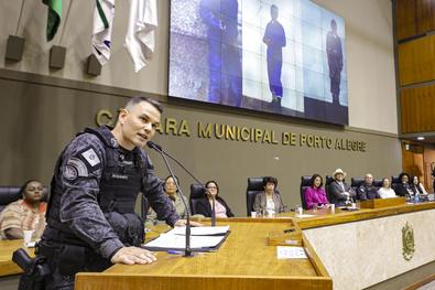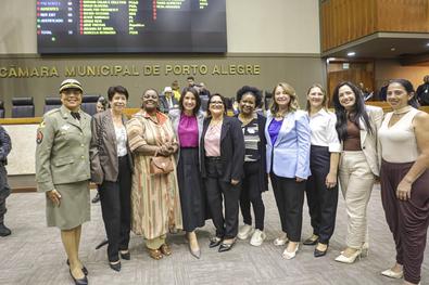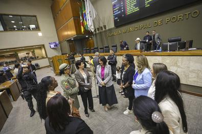 Porto Alegre, RS, Brasil, 10/11/2025: A prefeita em exercício, Comandante Nádia, participou, na tarde desta segunda-feira (10), da sessão plenária da Câmara Municipal de Vereadores (CMPA), em homenagem às primeiras militares femininas no então Batalhão de Choque (BPchq) da Brigada Militar, hoje 1º Batalhão de Operações Especiais (BOE). Foto: Alex Rocha/PMPA