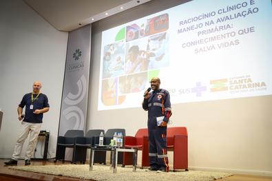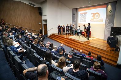 Porto Alegre, RS, 17/11/2025. O Serviço de Atendimento Móvel de Urgência (Samu) de Porto Alegre completa 30 anos de atuação em novembro. A data histórica é celebrada no dia 14. Nesta segunda-feira, 17, foi realizado o III Simpósio de Atendimento Pré-Hospitalar - 30 anos do Samu, no anfiteatro Carlos César de Albuquerque, do Hospital de Clínicas de Porto Alegre. Na foto o secretário da SMS, Fernando Ritter, e o paciente Carlos Henrique Bertoletti, atendido pelo Samu em 2024. Junto a eles, a equipe do Samu responsável por seu atendimento. Foto: Cristine Rochol/PMPA