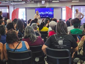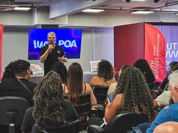 Porto Alegre, RS, Brasil, 21/03/2026: Cinquenta empreendedores de territórios periféricos de Porto Alegre foram selecionados para uma capacitação gratuita do programa HackaPOA, iniciativa da prefeitura que busca ampliar o acesso ao ecossistema de inovação e levar representantes das comunidades a um dos maiores eventos do setor na América Latina: o South Summit Brazil. A formação foi realizada neste sábado, 21, no Co.nectar Hub, no Centro Histórico, com conteúdos voltados à inovação, networking e identificação de oportunidades dentro do ecossistema empreendedor. Foto: Giulian Serafim/PMPA