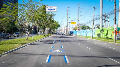 Porto Alegre, RS, Brasil - 10/10/2025: A Empresa Pública de Transporte e Circulação (EPTC) foi autorizada a implantar um projeto experimental de motofaixa de aproximadamente quatro quilômetros na avenida Assis Brasil, entre a avenida Joaquim Silveira, a partir do Terminal Triângulo, e a avenida Bernardino Silveira Amorim, no sentido Centro-bairro, próximo à Fiergs. A sinalização de faixa preferencial para circulação de motociclistas não está prevista no Código de Trânsito Brasileiro (CTB) e, por isso, depende de autorização específica da Secretaria Nacional de Transito (Senatran) para fins de estudo experimental. O objetivo do projeto é melhorar a circulação e reduzir os sinistros com envolvimento de motociclistas nesse trecho. Foto: Gustavo Roth/EPTC/PMPA