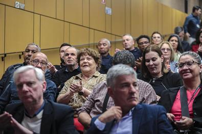 Porto Alegre, RS, Brasil, 31/10/2025: Em um evento que contou com a presença da vice-prefeita, Betina Worm, foi realizada na tarde desta sexta-feira (31), no auditório da Associação dos Auditores Fiscais da Receita Municipal de Porto Alegre (AIAMU), no bairro Centro Histórico, uma cerimônia para homenagear os servidores municipais pelo seu Tempo de Serviço. Foto: Alex Rocha/PMPA